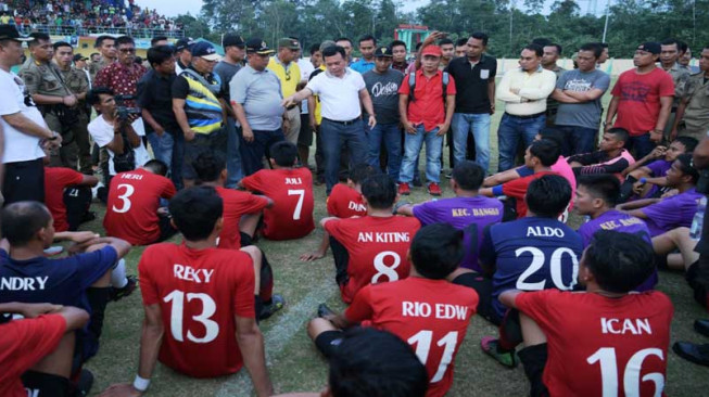 “Mari kita main profesional, jika ada pemain yang emosional dan tidak baik, cepat tukar, sehingga tidak mengganggu jalannya pertandingan. Kita ini main bola, bukan di ring tinju, jadi jangan sampai ada yang main jotos,”pinta Bupati.