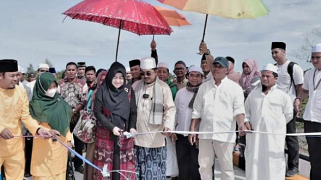 TANJABBAR, INFOJAMBI.COM - Usai melaksanakan Safari Jumat di Parit Jawa, Desa Muara Seberang, Kecamatan Seberang Kota, Bupati Tanjungjabung Barat, Anwar Sadat, didampingi Ketua TP PKK Tanjabbar, Fadhilah Sadat, meresmikan jembatan di Parit Selamat, Seberang Kota, Jumat (13/1/2023).