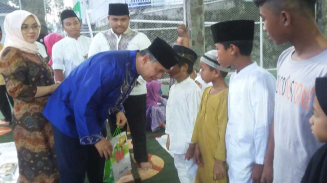 KOTAJAMBI — Walikota Jambi, H Syarif Fasha, bersama Ketua TP PKK Kota Jambi, Hj Yuliana Fasha, mengajak ratusan anak yatim piatu berbuka puasa bersama, di Rumah Dinas Walikota Jambi, Senin (5/6).