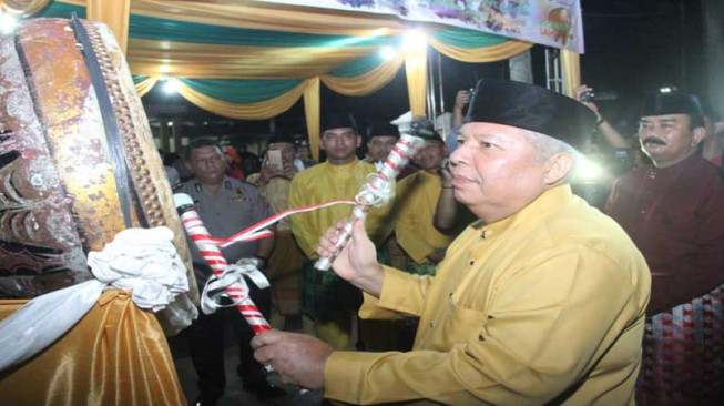 Pemukulan Bedug oleh Bupati DR Ir H Safrial,MS menandai dimulainya Festival Arak arakan (foto Raini)