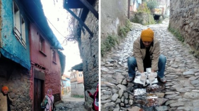 Isa membawa kami ke sana di tengah cuaca dingin berkisar 3 derajat. Desa tersebut terletak di pinggang bukit. Jalan mendaki dan melingkar di kiri kanan terdapat pohon yang daunnya berguguran.