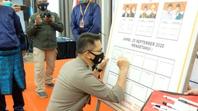INFOJAMBI.COM — Kapolda Jambi, Irjen Pol Firman Shantyabudi, menghadiri sosialisasi dan penandatangan pakta integritas, kepatuhan terhadap penerapan protokol kesehatan, pencegahan dan pengendalian covid-19 oleh para calon Gubernur dan Wakil Gubernur Jambi, Jum’at, 25 September 2020.