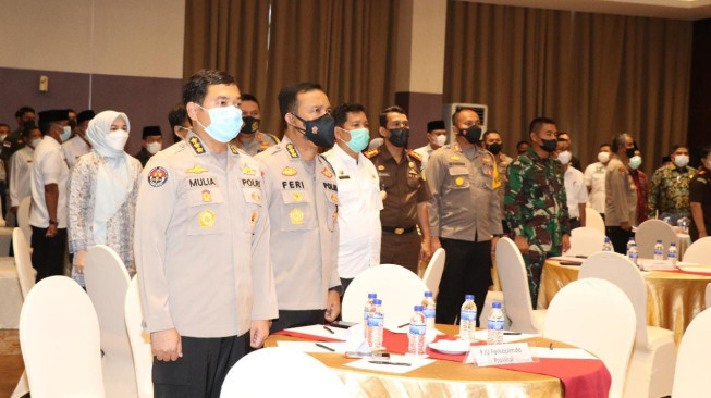 INFOJAMBI.COM - Kapolda Jambi Irjen Pol Albertus Rachmad Wibowo menghadiri pelaksanaan rapat koordinasi bersama unsur Forkopimda Provinsi Jambi yang membahas percepatan pemulihan ekonomi dampak dari pandemi Covid 19, di Hotel Aston, Rabu pagi (27/10/2021).