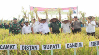 Panen raya dihadiri Ketua MPR Zulkifli Hasan, Menteri Pertanian Amran Sulaiman dan Kepala Staf Presiden (KSP) Moeldoko itu, Bamsoet menaiki sepeda motor dengan membonceng aparat bintara pembina desa (babinsa) demi ikut panen raya bersama para petani. ( Bambang Subagio – Palemabang )