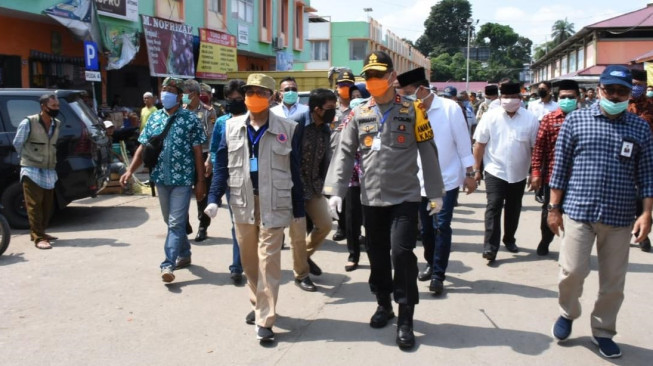 INFOJAMBI.COM - Kapolda Jambi, Irjen Pol Firman Shantyabudi, bersama Gubernur Jambi, H Fachrori Umar, dan Kepala Bulog Divre Jambi mengecek stok barang dan harga bahan pokok ( sembako), di Pasar Tradisional Angsoduo, Kota Jambi, Kamis (2/4/2020).