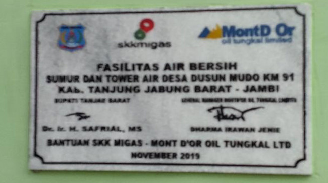 Di samping itu, warga sekitar juga tak luput dari perhatian SKK Migas - MontD'Or Oil Tungkal Ltd selama ini. Buktinya, di Desa Dusun Mudo, Tanjung Jabung Barat, dibantu fasilitas air bersih untuk keperluan masyarakat.