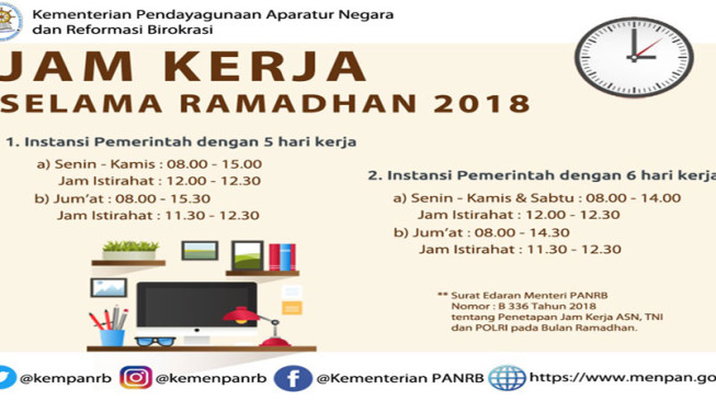 Berdasarkan Surat Edaran Menteri Pendayagunaan Aparatur Negara dan Reformasi Birokrasi (PANRB) No.336 tahun 2018, tentang Penetapan Jam Kerja ASN, TNI, dan POLRI pada Bulan Ramadhan, jam kerja dikurangi satu jam dari biasanya.