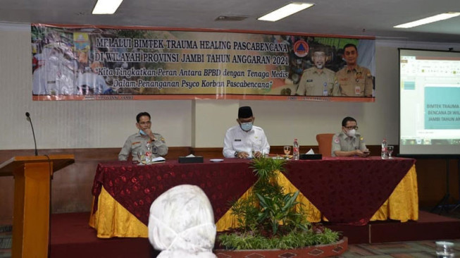 INFOJAMBI.COM - Pemerintah provinsi Jambi melalui Badan Penanggulangan Bencana Daerah (BPBD) melaksanakan bimtek trauma healing pasca bencana di wilayah Provinsi Jambi 2021.