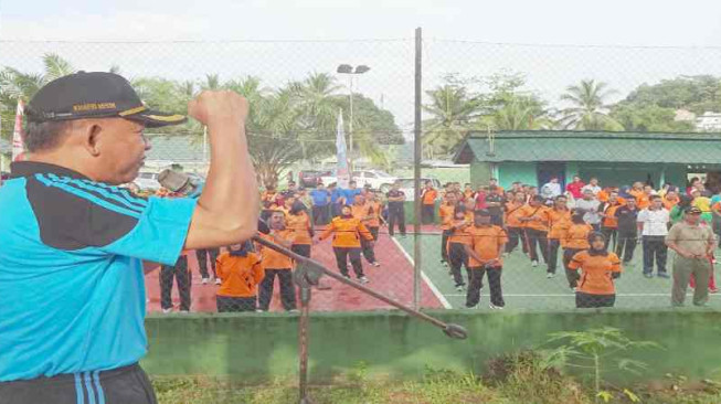 BANGKO - Wakil Bupati (Wabup) Merangin, HA Khafid Moein bersama pejabat dan pegawai Pemkab Merangin melakukan senam Jumat Sehat, di Asrama Koramil Bangko, Jum'at (10/3).